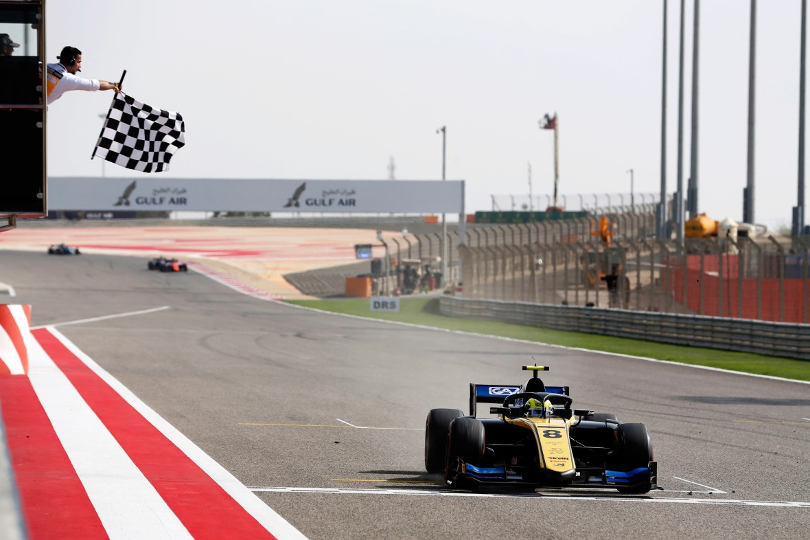 BAHRAIN INTERNATIONAL CIRCUIT, BAHRAIN – MARCH 31: Luca Ghiotto (ITA, UNI VIRTUOSI), takes the chequered flag to win the race during the Bahrain at Bahrain International Circuit on March 31, 2019 in Bahrain International Circuit, Bahrain. (Photo by Joe Portlock / LAT Images / FIA F2 Championship)