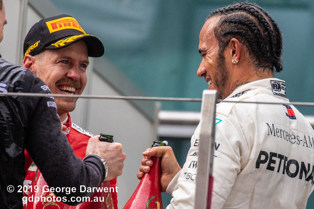 Lewis Hamilton (#44) of the Mercedes Formula 1 team celebrating on the podium of the 2019 Chinese Grand Prix with Sebastian Vettel.