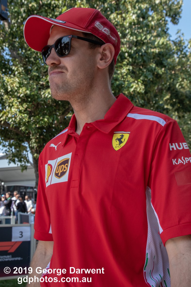 Sebastian Vettel (#5) of the Ferrari Formula 1 team in the paddock on Sunday of the 2019 Australian Grand Prix weekend.