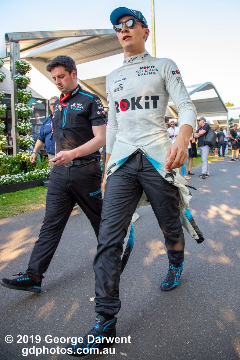 George Russell (#63) of the Williams Formula 1 team in the paddock on Saturday of the 2019 Australian Grand Prix weekend.