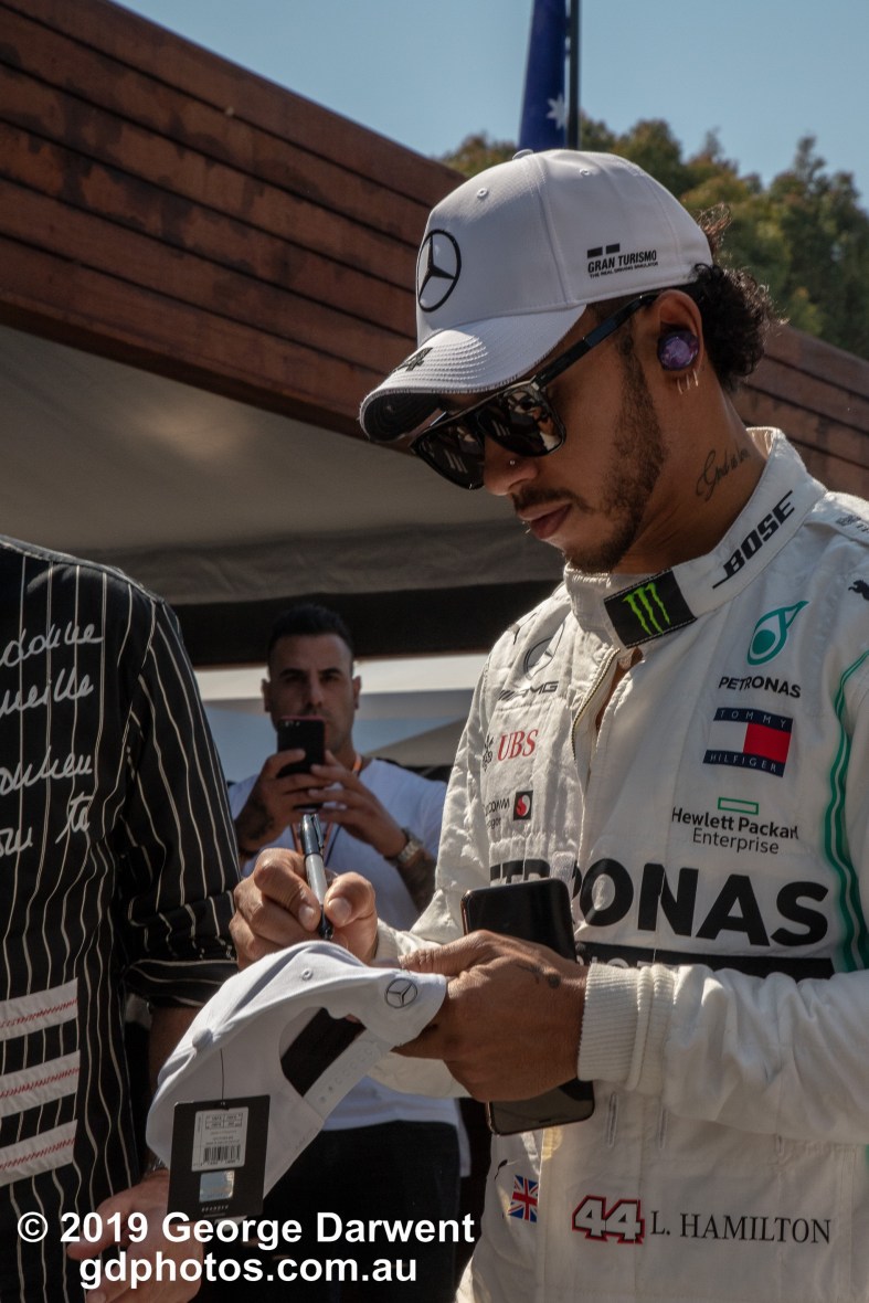 Lewis Hamilton (#44) of the Mercedes Formula 1 team signs an autograph for an elderly fanboy in the paddock on Sunday of the 2019 Australian Grand Prix weekend.