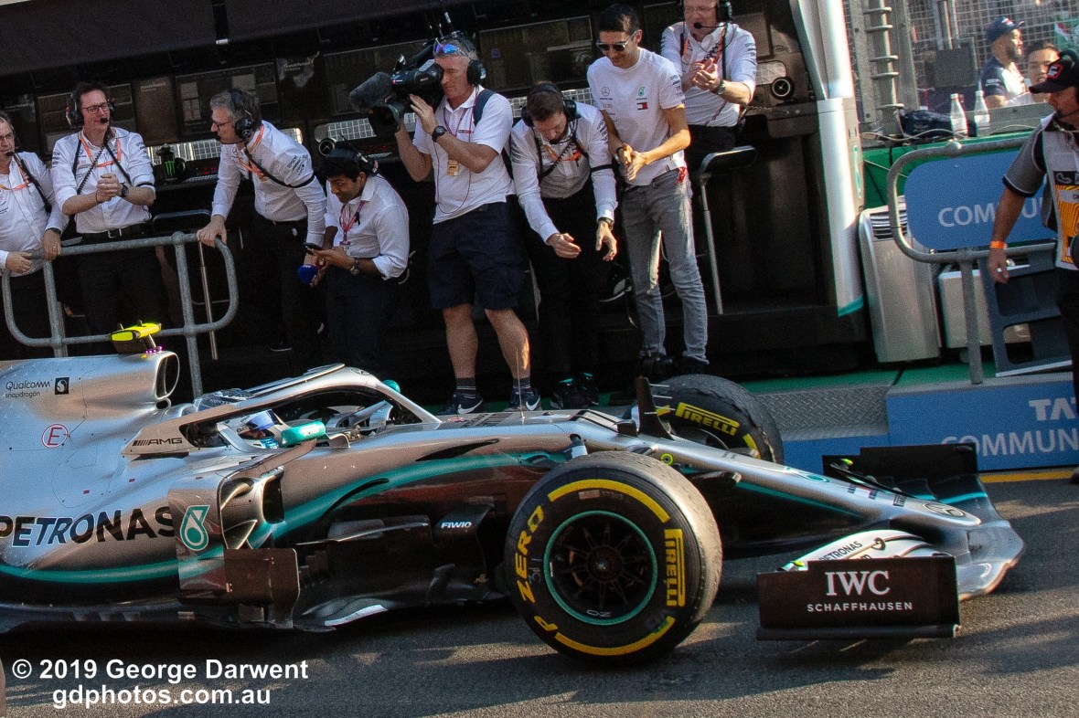 Valtteri Bottas (#77) of the Mercedes Formula 1 team celebrates winning the 2019 Australian Grand Prix.