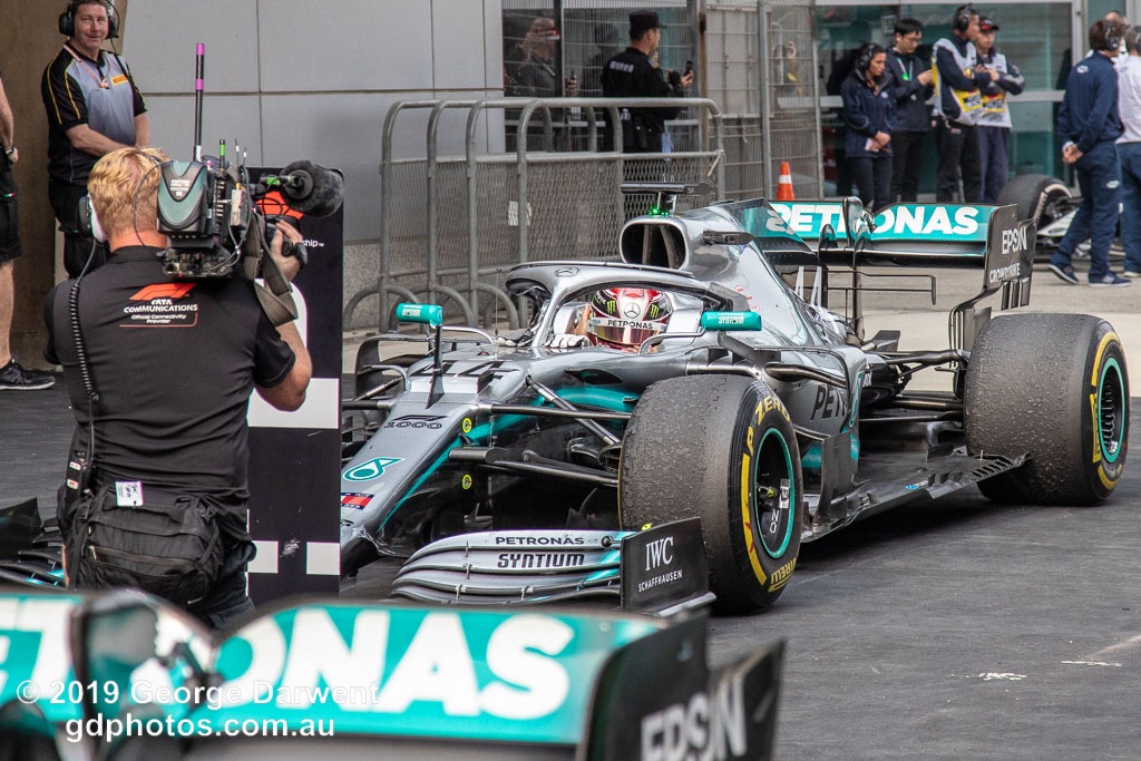 Lewis Hamilton (#44) of the Mercedes Formula 1 team celebrates winning the 2019 Chinese Grand Prix weekend.