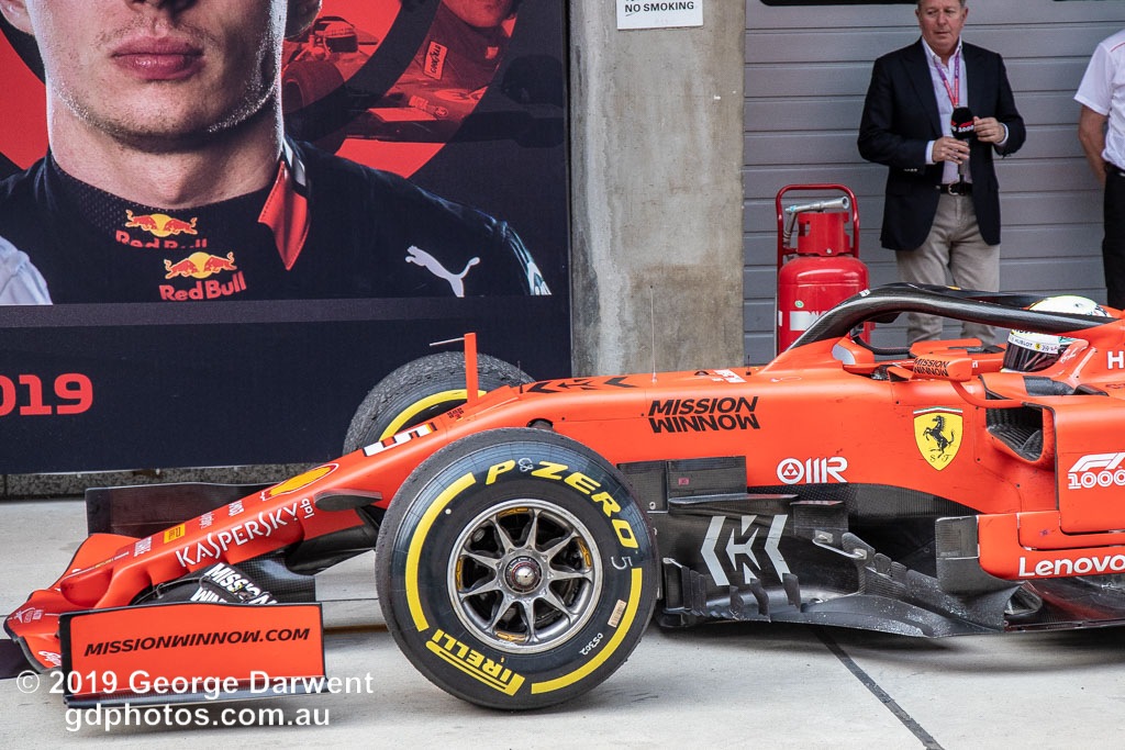 Sebastian Vettel (#5) of the Ferrari Formula 1 team in parc ferme follwing the 2019 Chinese Grand Prix weekend.