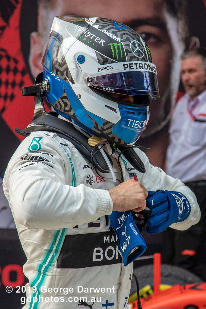 Valtteri Bottas (#77) of the Mercedes Formula 1 team in parc ferme follwing the 2019 Chinese Grand Prix weekend.