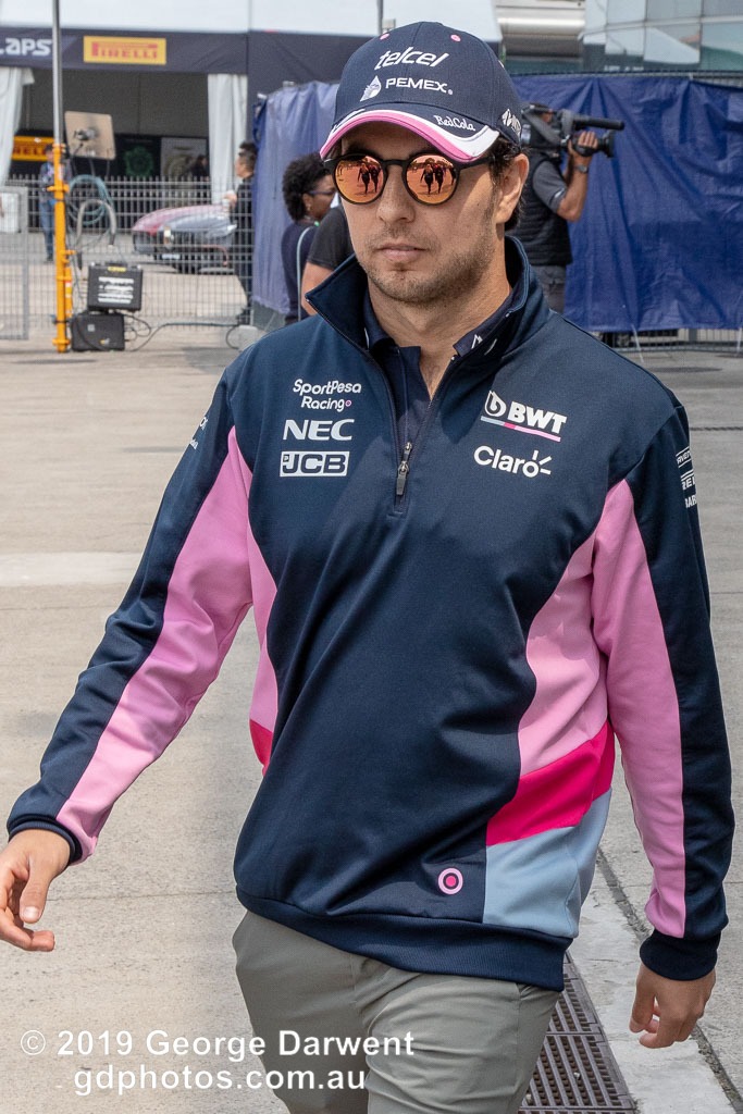 Sergio Perez (#11) of the Racing Point Formula 1 team in the paddock on Sunday of the 2019 Chinese Grand Prix weekend.